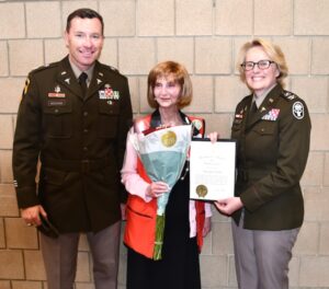 Wanda Smith (C), poses with Womack Commander, Col. Stephanie Mont (R) and Lt. Col. Casey Mckenna after accepting the North Carolina Governor’s Volunteer Service Award on June 16, 2025.